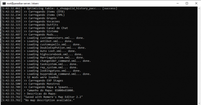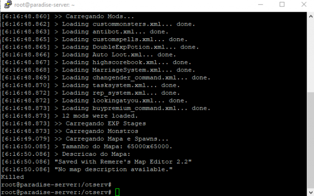 Uso TFS 0.4 , compilei em ubutu 14, e estou tentando abrir o servidor, mas toda tentativa acontece isso, a pois a tela de load mapa, sai, e nao abre o servidor o tfs simplismente fecha. Alguém tem ideia doq pode ser? talvez o tamanho do mapa? servidor Núcleos do Processador 1 Velocidade Total do Procesador 2.4Ghz Memória 1Gb Espaço em disco 20Gb Largura de Banda 1000Gb no putty