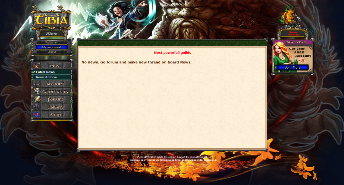 Olá pessoal, estou com a seguinte dúvida: Eu baixei o gesior 0.36 pela otland do próprio gesior, ou seja, original... Porém ele não vem com news ticker/notícias/shop arrumado. Veja as fotos! Então, queria saber como colocar news ticker, notícias o título escrito em cada página e arrumar o shop, para adicionar pontos e itens.. Agradeço desde já! OBS.: Realizei o download deste gesior original, pois é uma versão bastante estável, e o único problema que vejo é este, aguardo uma resposta!